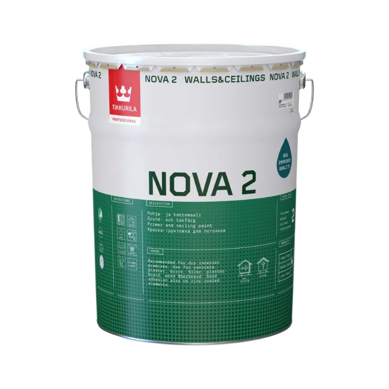 Краску Nova 2 используйте для стен и потолков в сухих помещениях. Подходит для бетонных, оштукатуренных, шпаклёвочных, гипсокартонных, ДСП и древесноволокнистых поверхностей. Nova 2 также обеспечивает хорошую адгезию к оцинкованным элементам.