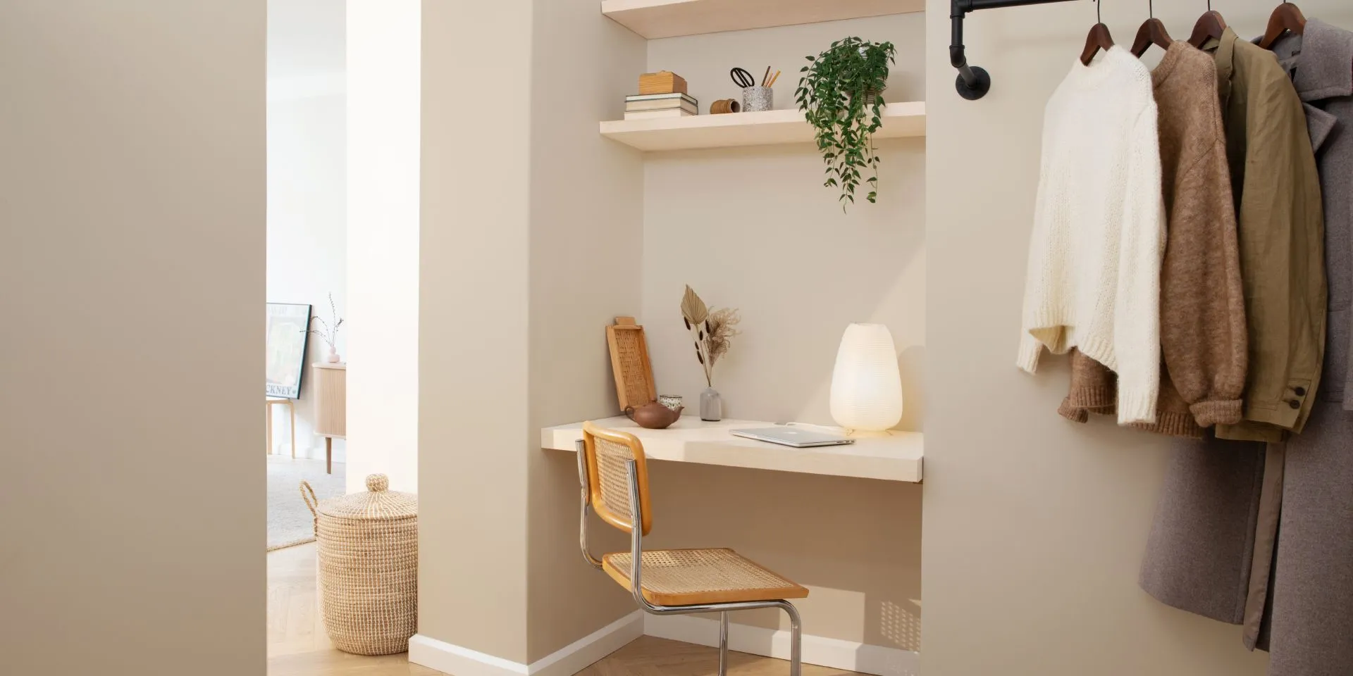 В этом небольшом домашнем офисе стены окрашены в теплый бежевый цвет X459 Сон от Tikkurila, который является одним из ключевых цветов богемного стиля. Светло-бежевый цвет придает пространству мягкость, делает его более гармоничным и продуманным. Теплый цвет стен в сочетании с украшениями из органических материалов создают непринужденную атмосферу, которая редко встречается в традиционных офисных помещениях.