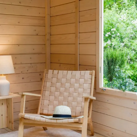 Садовый сруб — это идеальное место для отдыха, где можно расслабиться и насладиться пением птиц и шумом ветра среди деревьев. Большие окна обеспечивают постоянную связь с природой, позволяя любоваться окружающими видами. Домик также служит уютной дополнительной комнатой для размещения гостей летом. Уютные одеяла и подушки добавят мягкости и комфорта в обстановку.