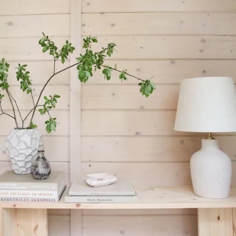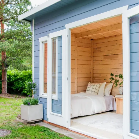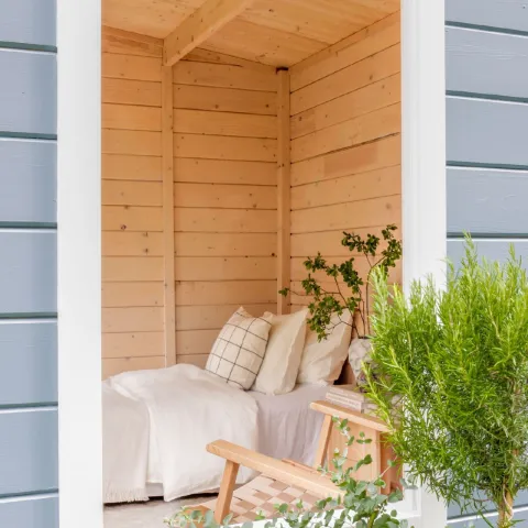 Этот садовый сруб был окрашен снаружи краской Tikkurila Q451, придающей ему простой, но живой синий оттенок с серым подтоном. Внешние стены покрыты непрозрачной краской для деревянных фасадов Vinha, а белые оконные рамы Tiira подчеркивают светлый и безмятежный стиль. Сочетание этих внешних цветов с натуральным деревом, утонченными деталями и простым дизайном интерьера создает успокаивающую атмосферу.
